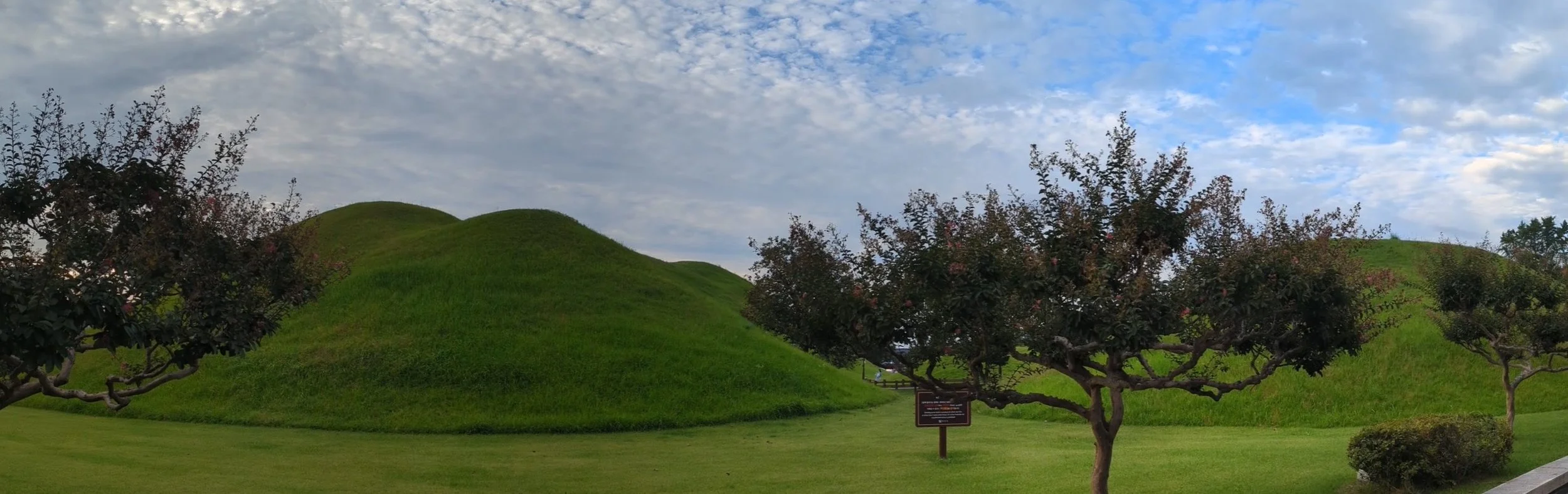 Direkt in Gyeongju waren wir absolut beeindruckt von den Daereungwon Gräbern, die ebenfalls ein UNESCO Welterbe darstellen. Wir wussten beide nicht, dass es so etwas gibt, aber das sind so etwas wie begrünte Pyramiden. Alte Gräber für Könige und bedeutende Personen des Silla-Reichs in Pyramidenform, die danach aber noch mit Erde bedeckt wurden und mit der Zeit natürlich als Hügel in der Landschaft aufgingen. Absolut faszinierend. Die größten Hügel sind zwei Doppelhügel (23 und 22 Meter hoch), in denen das Königspaar beerdigt wurde. Und mit ihnen unglaubliche 30.000 Relikte aus dem 5.Jhdt.